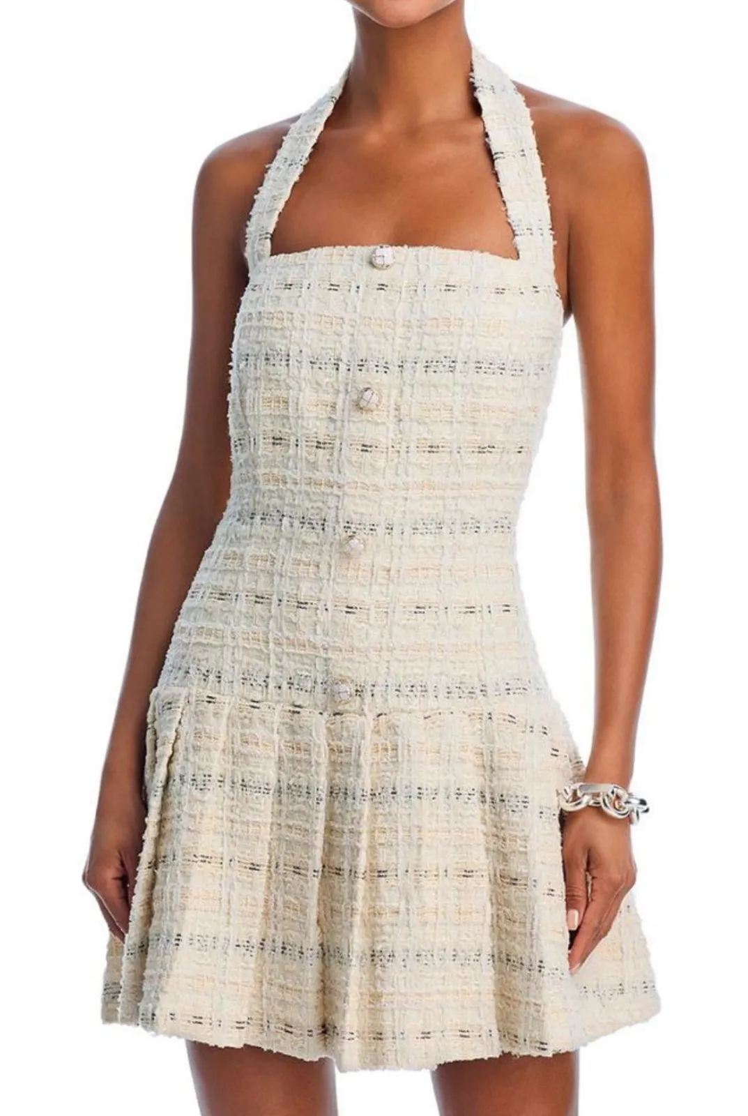 Keywords: AQUA, halter dress, mini dress, tweed dress, sleeveless dress, party dress, cocktail dress, flared skirt, button front, cream dress, contemporary fashion, women's dress, size L