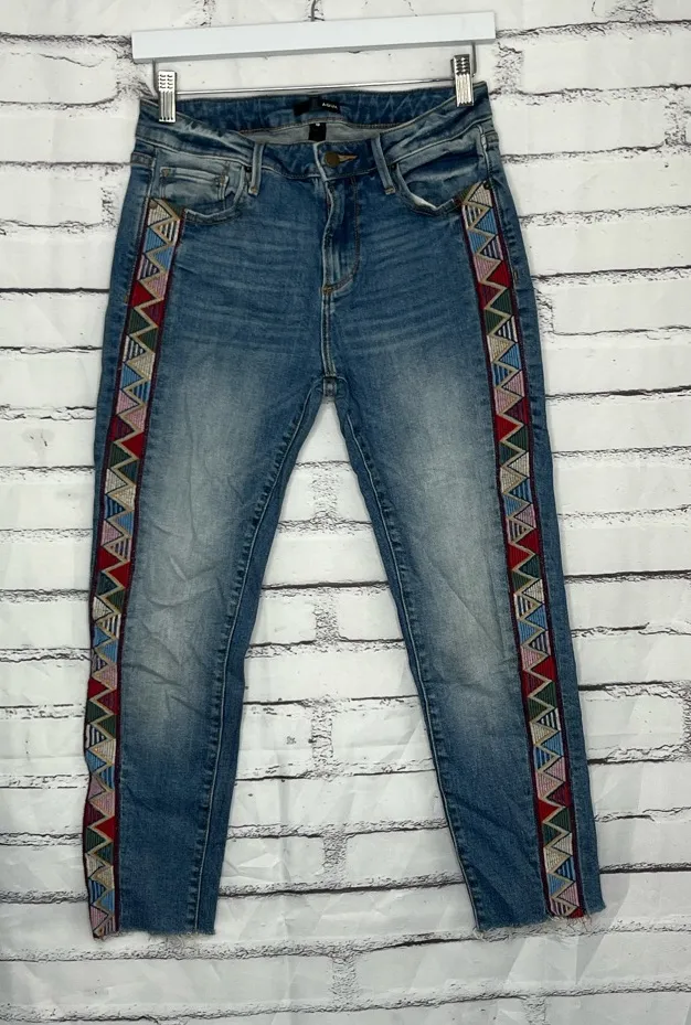 Brand: Aqua Style: Skinny Jeans with Aztec Embroidered Side Panels Color: Mid Wash Blue Size: 26 Mea... Show more