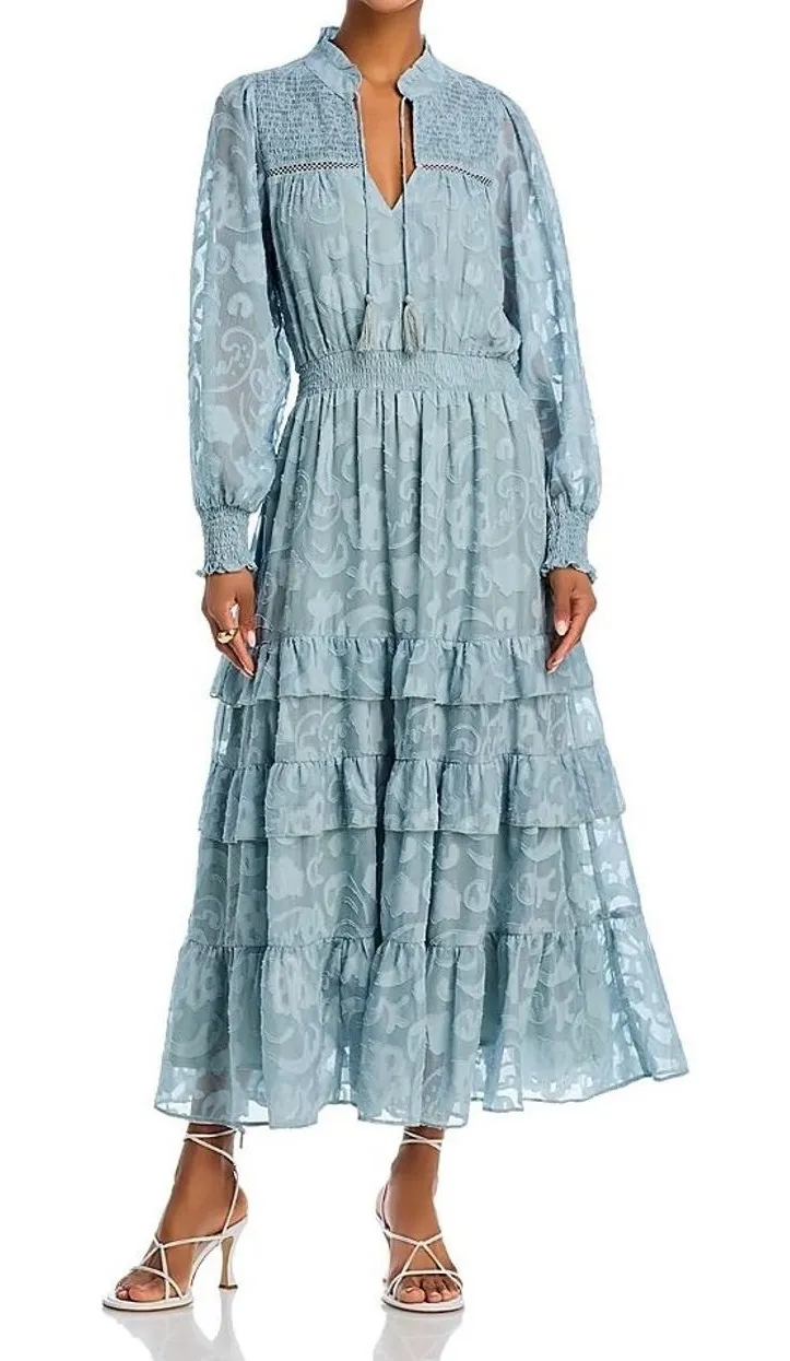 Keywords: AQUA, maxi dress, long sleeve dress, tiered dress, ruffle dress, smocked dress, boho dress, bohemian dress, floral dress, party dress, evening dress, casual dress, women's dress, xs dress, blue dress