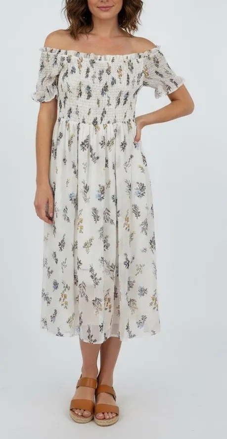 AQUA off the shoulder midi dress in a charming floral print. This dress features a fully smocked bod... Show more