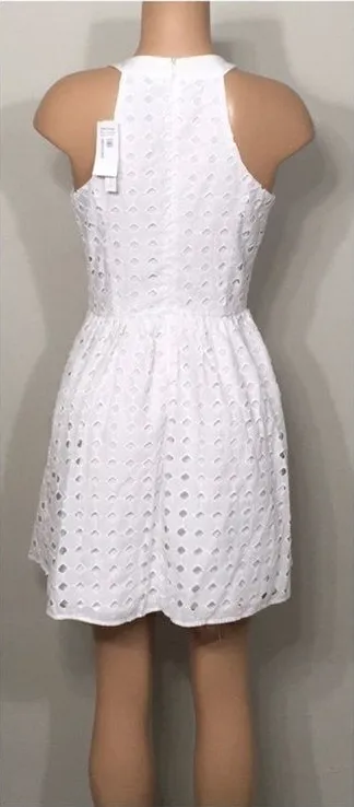 White eyelet high neck dress. Gathered at the waist for a cool 50’s-60’s look. Hidden zipper in back... Show more