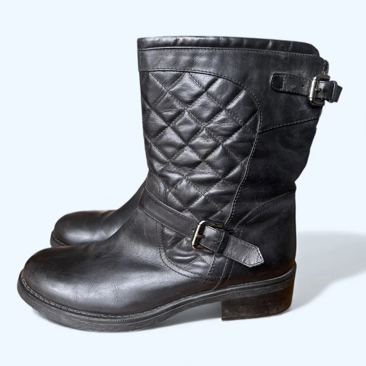 Luxury Italian-made Aquatalia moto boots crafted from smooth black leather with quilted panel detailing. Designed with adjustable buckle straps, a durable lug sole for traction, and a soft lined interior for comfort. A timeless, elevated biker boot perfect for fall and winter wear. Details: • Brand: Aquatalia • Women’s size 12 • Color: Black • Genuine leather upper • Quilted leather paneling • Adjustable buckle straps • Lined interior • Round toe • Low stacked heel Condition: Good pre-owned condition. Light wear consistent with normal use. No flaws noted. Aquatalia boots, moto boots, biker boots, quilted leather boots, lug sole boots, Italian leather boots, luxury boots, women’s size 12 boots, fall winter footwear quiet luxury preppy grunge punk fall winter