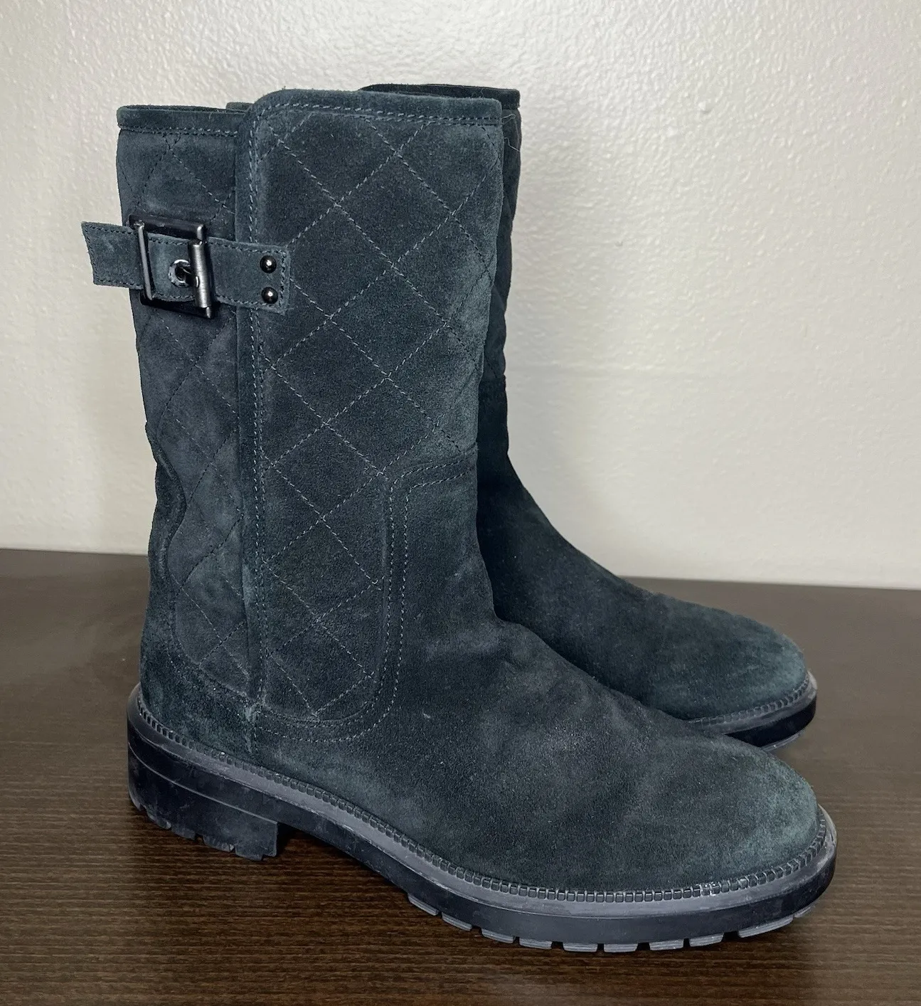 A beautiful high quality pair of boots by aquatalia Women's size 7:5 -mid calf -quilted -buckle detail -heeled -suede Has a wear on suede (see photos) still in good condition with lots of wear left