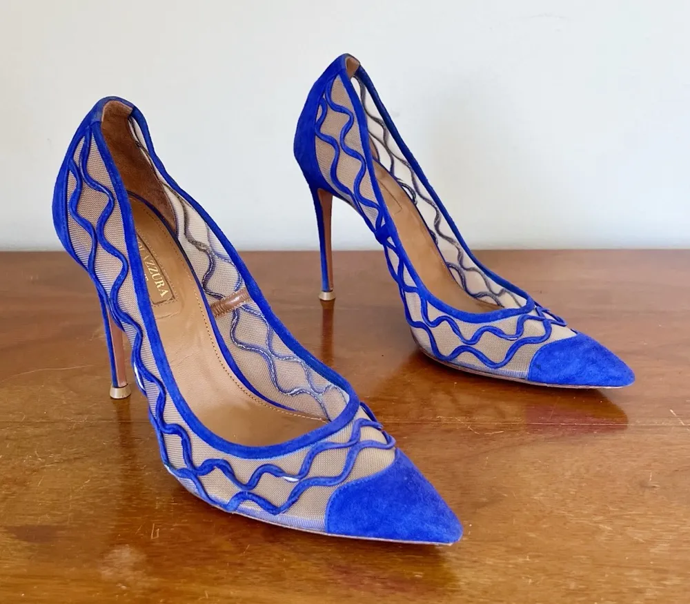 Gorgeous heels by Italian shoe designer Aquazzura. “Kai” style in royal/cobalt blue suede leather ft pointed toe and mesh side panels with swirling suede detailing. Heel height 4”. Size 38, equal to US 8 according to Aquazzura size chart, great preowned condition - some signs of wear to suede detailing and to suede finish at heels (see photos).