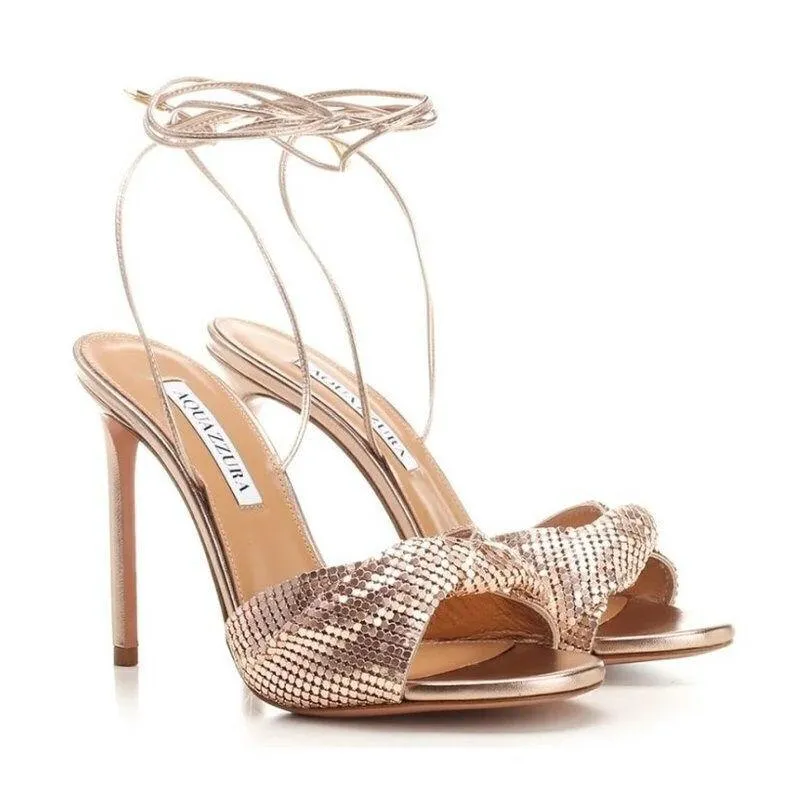 A playful take on Aquazzura's iconic 'Twist' collection, these 'Metal' sandals are updated with shimmery chainmail. They're crafted from rose-gold leather with a lustrous sheen and topped with shining hardware at the slender ankle ties. Adjustable wrap tie closure Padded leather insole with 'Aquazzura' label Almond toe Open toe with twist vamp Approx 105mm/4.1-inch heel Satin sequin upper over leather, with Nappa leather sole Made in Italy Our Style No. AAZZ-WZ376 Manufacturer Style No. MTWHIGS0-MNT Color: Satin Gold MSRP: $1,250.00 Size: Womens 36 Condition: Pre-Owned please view photos for damage, comes with dust bag Tags: Designer, French, Parisian, date night, party, flirty, sexy, formal, event, date, evening, pumps, formal, rhinestone, swavorski, cocktail, fancy, black tie, wedding, bridal, bride, chainmail, metal,