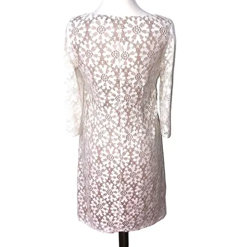 Eliza J Ivory Lace Shift Dress Excellent Preowned Condition Romantic detailed lace brings rich texture and dimension to a bateau-neck shift dress designed with ivory lace over a nude lining. Back zip closure Bateau neck Three-quarter sleeves Lined 90%Nylon 10% Spandex Hand wash Style NO6M7469 Approximate Measurements: * Pit to Pit: 19” * Shoulder to Hem: 36” * Waist: 17” * Hip: 19” I24785 Wedding bridal shower engagement bachelorette graduation sorority