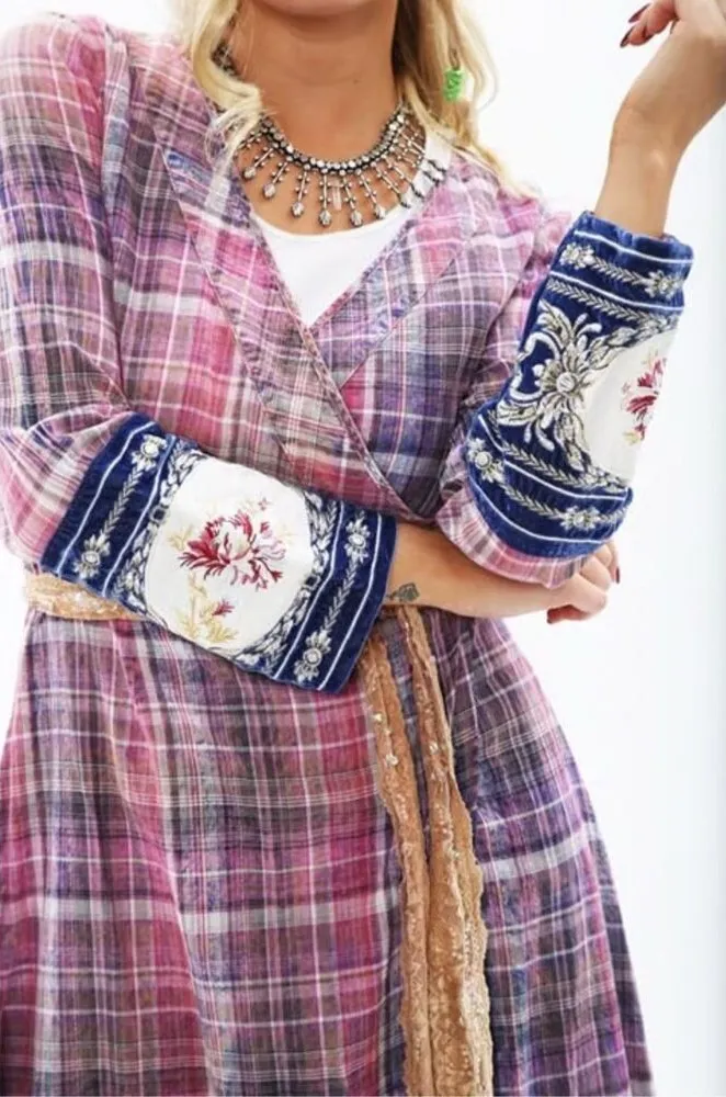 Aratta Silent Journey Boho Plaid Purple Pink Wrap Dress Size XS. It’s a true wrap dress, so it’s very giving. It can probably fit up to a size S. It’s in excellent condition, either only a few loose threads on the sash. Sold at Anthropologie. Bring effortless boho vibes to your wardrobe with this Aratta Silent Journey Wrap Dress. Featuring a soft purple and pink plaid pattern, this dress blends rustic charm with feminine flair. The velvet cuffs with intricate embroidery add a luxe touch, while the lace sash with sequin detailing cinches the waist for a flattering silhouette. Lightweight and flowy, this dress is perfect for layering—pair it with jeans and boots for a laid-back fall look or wear it solo for a breezy transitional outfit. A true statement piece for any bohemian fall wardrobe.