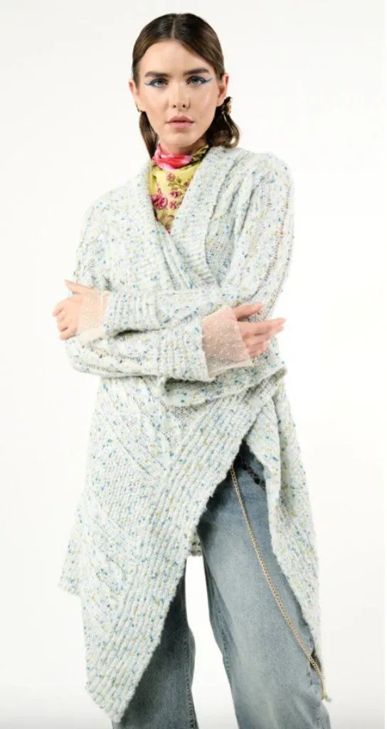 Aratta Silent Journey Fontvielle Shawl. Draped waterfall open front. Long sleeve. Cable knit details... Show more