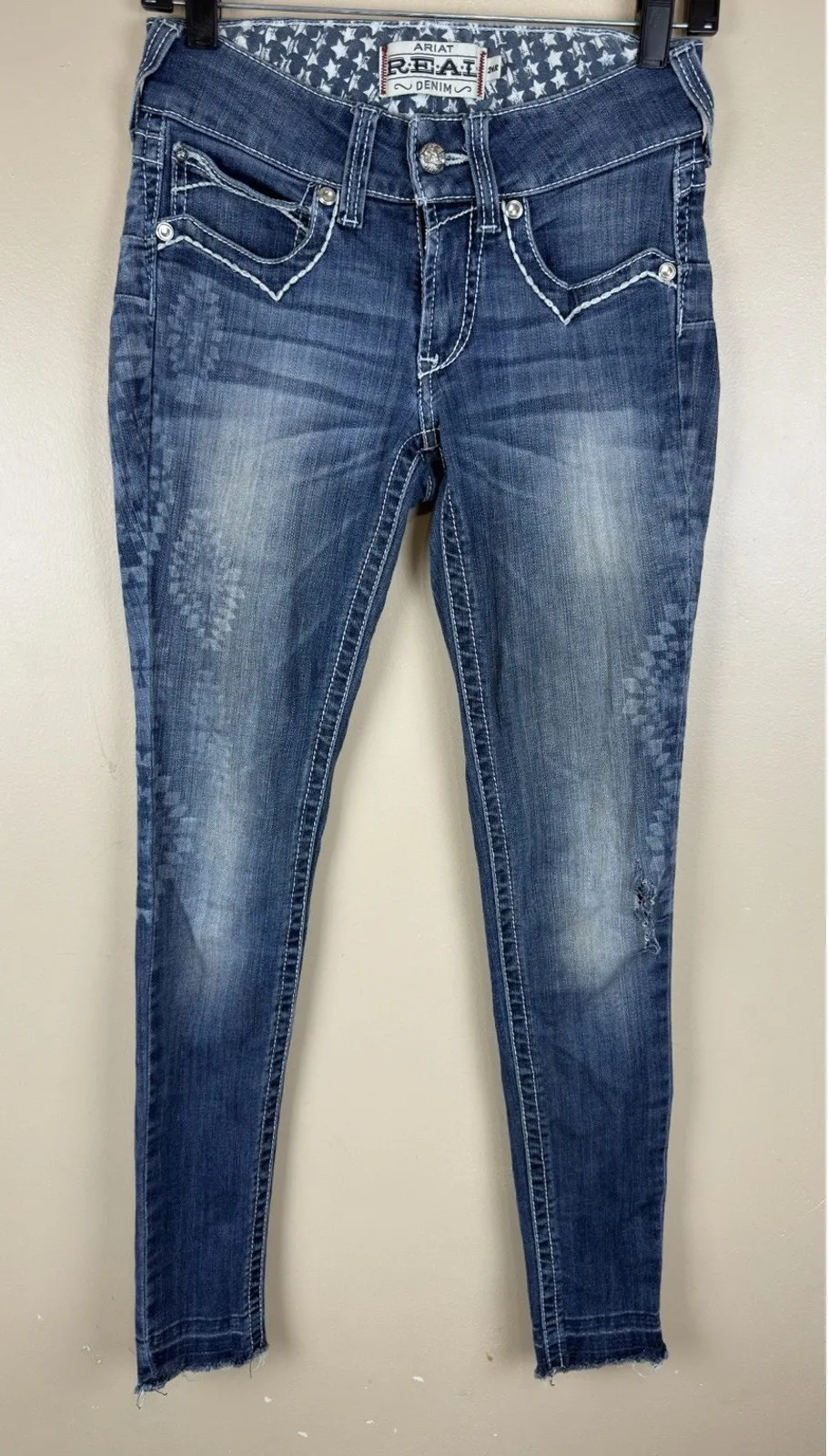 Ariat Real Denim skinny low-rise jeans, size 26 R. Frayed hem for a modern, versatile style.