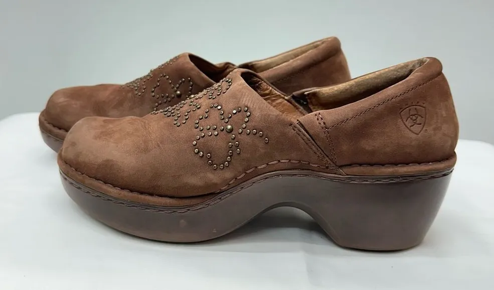 Ariat western wear clogs shoes brown leather with rhinestone floral accent women's 8.5 style 21203