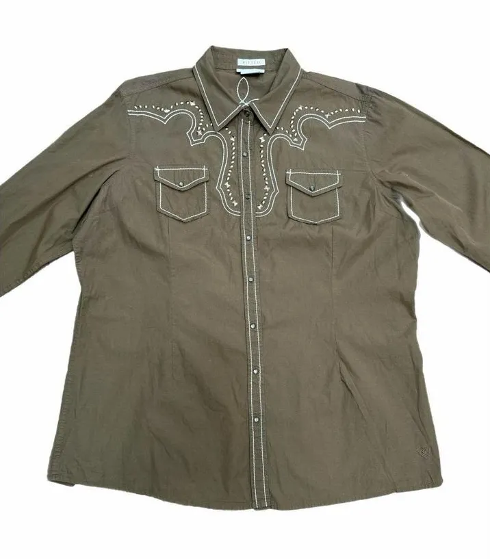 Stylish Ariat Women's Fitted Western snap shirt in a rich brown hue with white embroidery and pearl... Show more