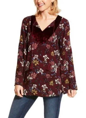 Ariat Roulette Velvet Tie-Neck Blouse Burgundy Floral Size Small Excellent pre-owned care - no flaws... Show more