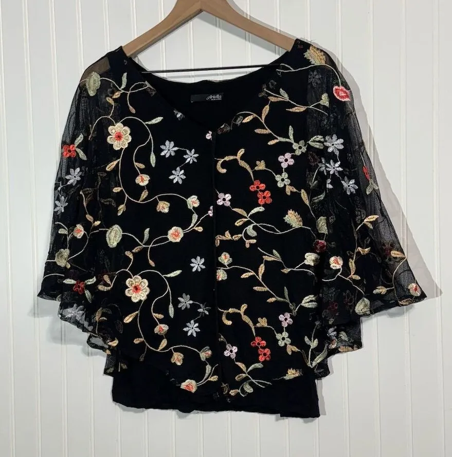 High-quality statement top by Ariella, known for their Made in U.S.A. boutique fashion. This blouse features a two-in-one construction: a comfortable, fitted black Rayon/Spandex tank liner beneath a sheer black mesh overlay. The mesh shell is intricately detailed with flowing floral and vine embroidery in vibrant metallic gold and multi-color threads. The fit is draped and flowing through the arms and body, creating an elegant, cape-like silhouette. Perfect for special occasions, holidays, or channeling the Romantic Goth / Fairycore aesthetic. Condition Detail: Excellent Used Condition. Embroidery is fully intact. Hand wash only. Embroidered Top, Mesh Overlay, Sheer, Floral, Black Goth, Romantic, Fairycore, Whimsigoth, Cape Top, Dolman Sleeve, Made in USA, Vintage Aesthetic.