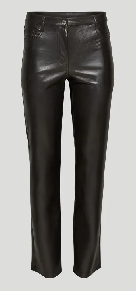 The one, the only, the Melina. These are low-rise, straight-legged pants with five-pocket styling and a universally flattering fit. They’re made with our innovative Vegan Leather that looks and feels like the real thing. They have an authentic drape and soft sheen that feels right from day one. Size: 6 Waist: 27” Hips: 37” Inseam: 29.75” Features: Zip fly with tack button closure Top stitch detailing throughout Materials & Care: Content: 100% polyurethane; Interior: 100% polyester Care: Machine wash Imported Rise: Low Leg: Slim Length: Ground — Intended to hit at the ground while wearing flat shoes Height: Regular — Designed for heights around 5’5" Model is 5'10"/178cm wearing a size 4 On average, customers say it fits true to size