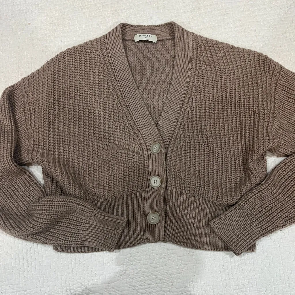 Aritzia Babaton Canberra Merino Wool Cardigan V-neck cardigan with a three-button closure and dropped shoulders. Extra-fine 100% merino wool yarn, naturally warm and super soft feel. Constructed using a Half Cardigan stitch with vertical ribs for a textural look and feel. Warm Taupe Size 2XS Some minor pilling on sleeves, otherwise in perfect condition ✨bundle & save✨ the proceeds from all sales are going towards starting my own fashion brand, thank you so much for your support xx This item is pre-loved, I do my best to review all items before listing and note any flaws, however some items may show signs of use from previous wear.