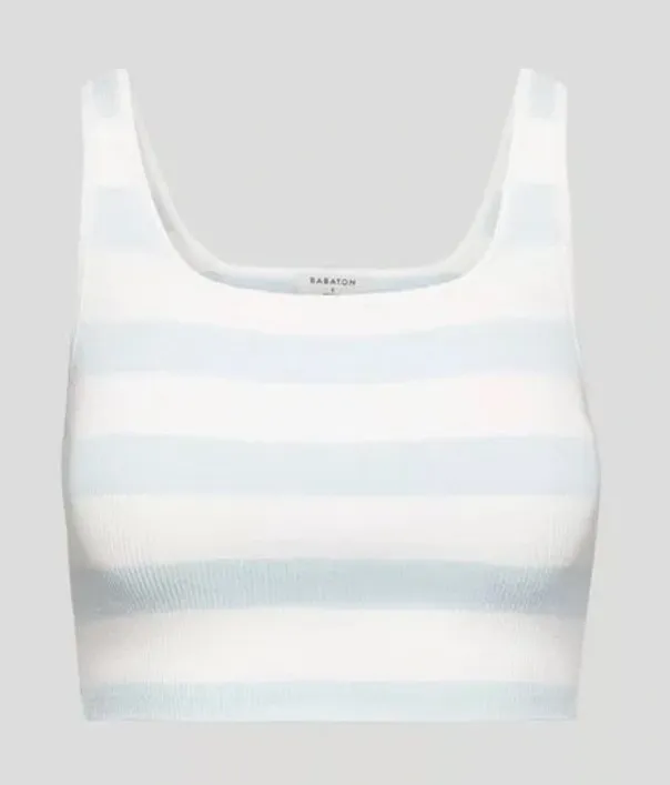 Aritzia BABATON Knit Crop Top Striped Coastal Soft Girl Summer Preppy Womens Size XS Extras Small Light blue and white stripes Signature sculpt knit yarn - figure smoothing Square neckline Cropped length Wide strap Ribbed textured feel Great condition. No stains or holes. *Measurements taken laying flat and are approximate: Pit to pit: 11.5” Shoulder to hem: 13” Nylon/Elastane