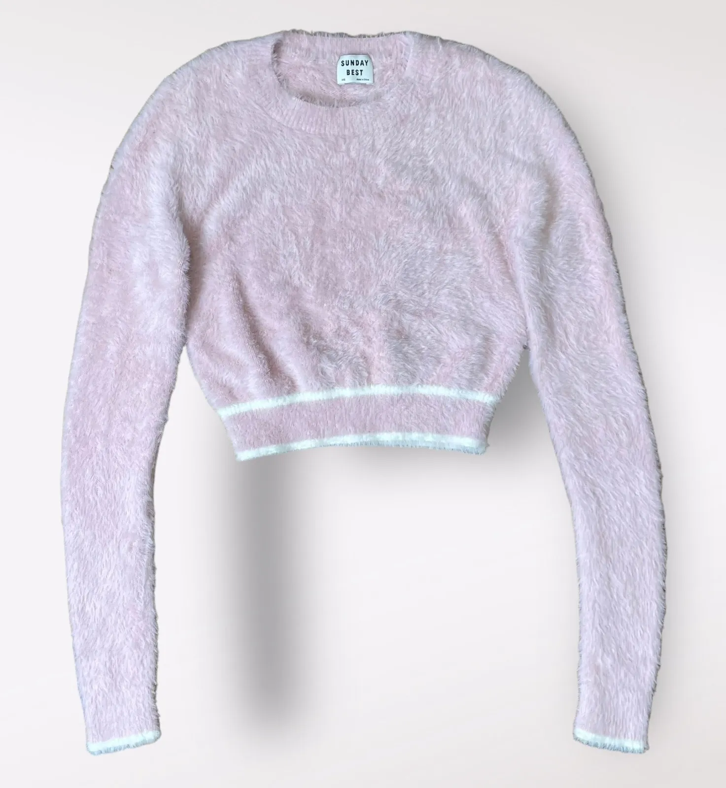 Aritzia Sunday Best Taro Baby Pink with white stripe, Cropped, Fuzzy, Extra soft Sweater Style # SNH... Show more