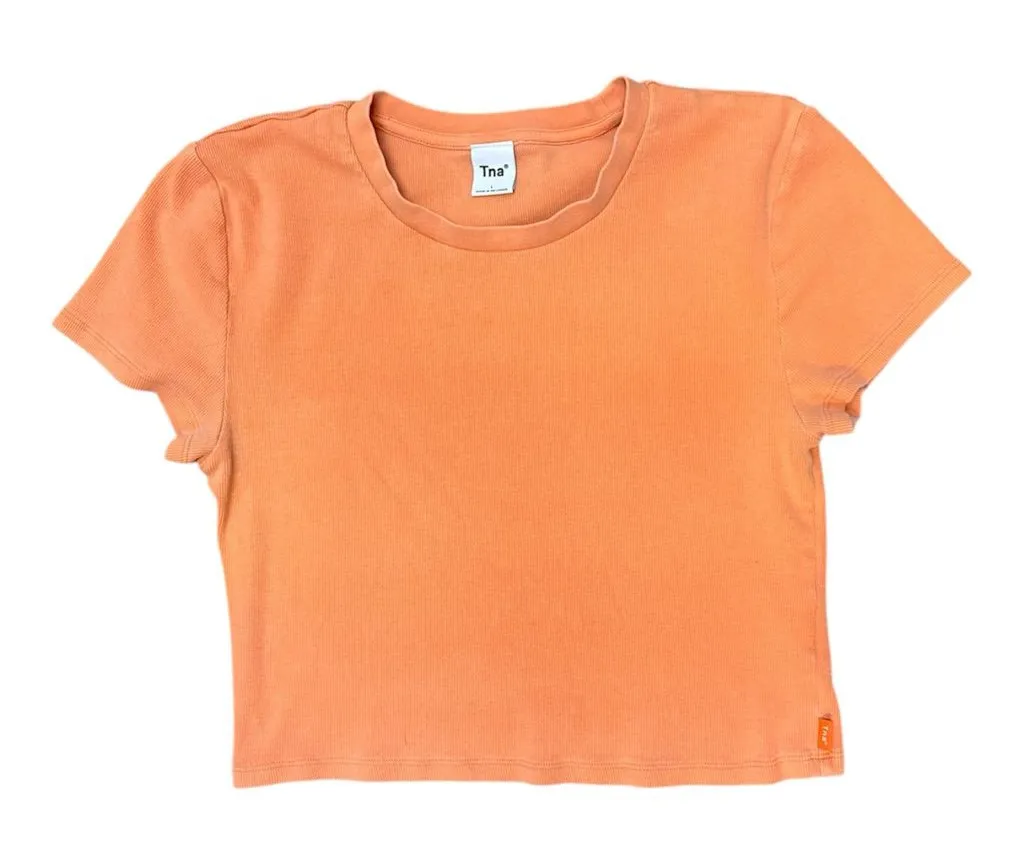 Aritzia TNA ribbed cropped tee in a bright orange hue featuring soft stretch cotton and a flattering fitted silhouette. • Brand: Aritzia / TNA • Size: Large • Color: Faded Orange • Material: 94% cotton, 6% elastane • Fit: Cropped, fitted • Fabric: Ribbed stretch knit • Condition: Great pre-owned condition Keywords: Aritzia TNA top, ribbed crop top, cropped tee, orange crop top, women large top, stretch cotton tee, fitted ribbed top, casual basic tee, minimalist top, summer crop top, everyday wear top