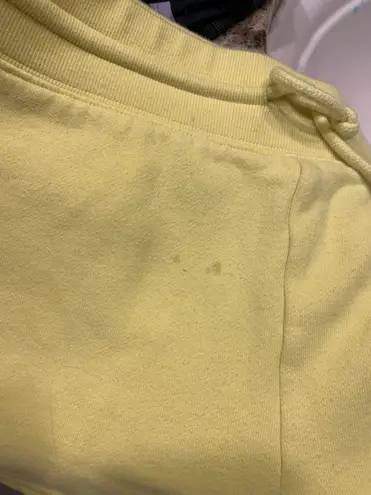 Thick sweat shorts in bright yellow color, small stain on front of shorts, single pocket in the back... Show more