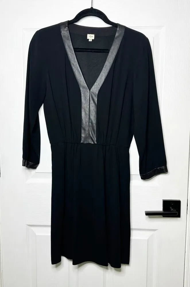 Pull on style long sleeve v-neck dress with faux leather trim along neckline and cuffs. Pockets. *S... Show more