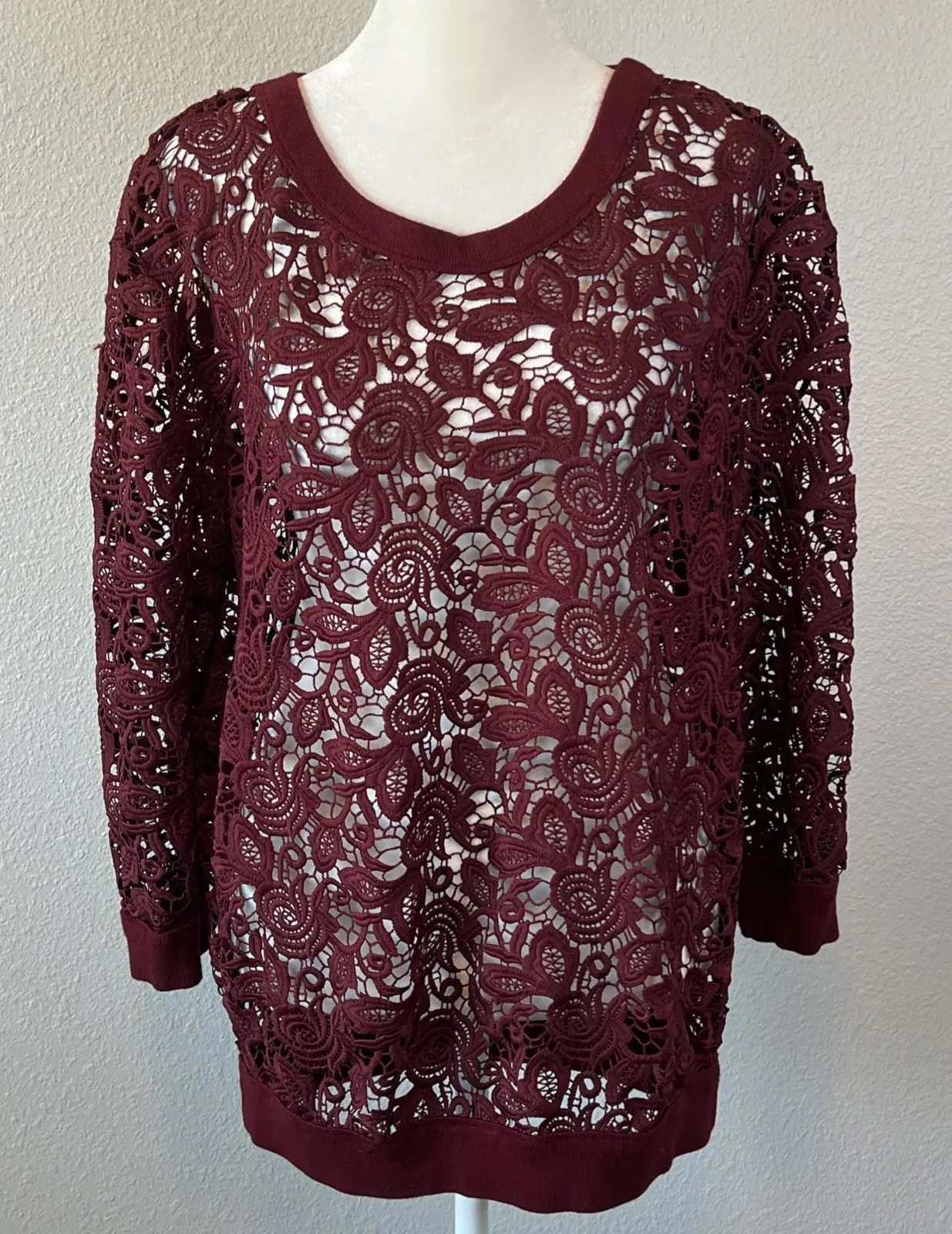 Size XS No content tag - lace shirt with sweatshirt banding at wrist and bottom Burgundy lace, unl... Show more