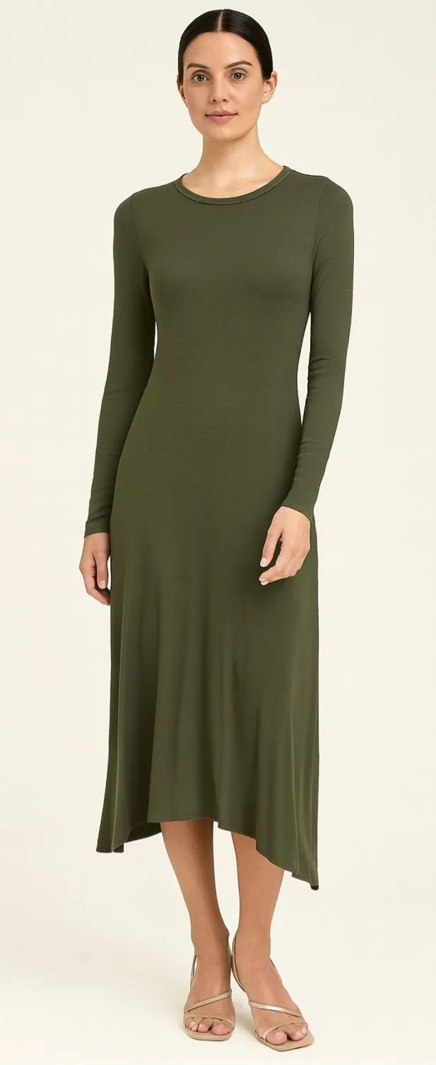 Minimalist and chic Aritzia Wilfred Free bodycon midi dress in soft lightweight stretch jersey. Features long sleeves, a flattering body-skimming fit, and an asymmetrical raw-edge hemline for a modern, edgy vibe. Effortless and comfortable while still sleek and polished — perfect for fall layering, casual nights out, or weekend brunch. Excellent pre-loved condition. ✨ Details: • Brand: Aritzia Wilfred Free • Style: Bodycon long sleeve asymmetrical midi dress • Color: Olive green • Fabric: Lightweight stretch jersey (soft and breathable) • Neckline: Crew neck • Hem: Asymmetrical raw edge • Size: XXS • Condition: Excellent pre-owned Keywords / Occasions: Aritzia midi dress, Wilfred Free bodycon dress, long sleeve fall dress, olive green minimalist dress, asymmetrical hem dress, casual chic outfit, work-from-home style, date night dress, modern basics, fall layering dress, comfortable travel dress