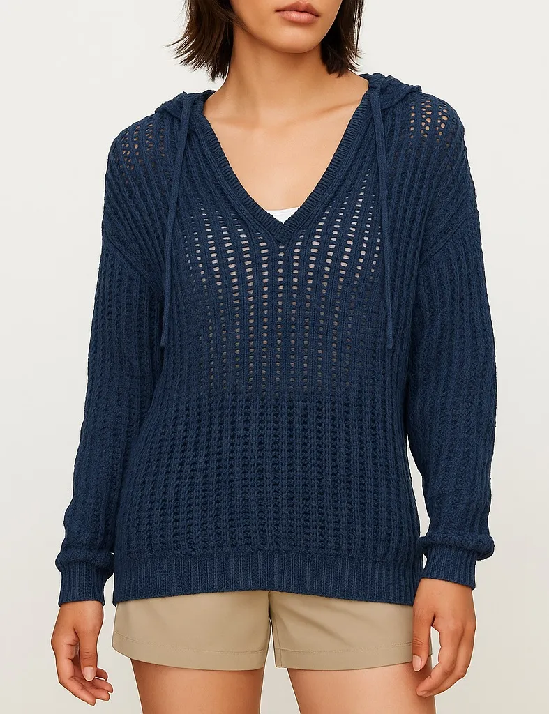Wilfred Free navy blue open-knit cotton hoodie sweater in size L. Relaxed fit with drawcord hood, ai... Show more