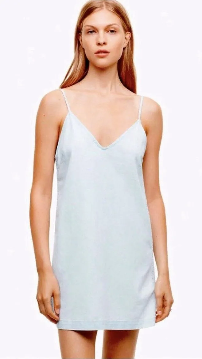 Aritzia Wilfred Free Vivienne Mini Slip Dress in Light Distressed Denim / Blue. A slinky dress in lo... Show more