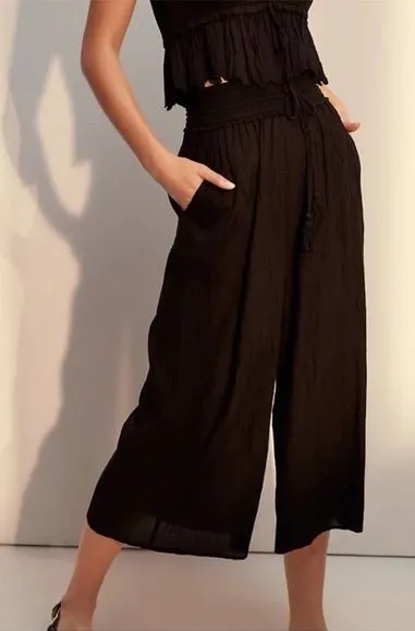 This is a flowy, wide-leg pant with a drawstring waist. It's made with an airy, fluid fabric that ha... Show more