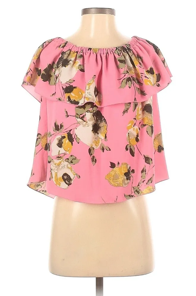 Ruffled off shoulder overlay Wilfred Promener blouse.. "Aurora Pink Birch" colorway: Multicolored muted yellow, sage green, and white floral print. Elasticized/stretchy neckline/off shoulder layer. Good preowned condition size small from Aritzia.com: "This shoulder-baring top is made from Japanese fabric from an innovative mill. It hangs beautifully and stays looking polished all day." 100% Polyester Trim: 100% Silk Summer Spring Blouses Cruise Resort Vacation Festival Colorful| Preppy Riviera Boho floral flowers
