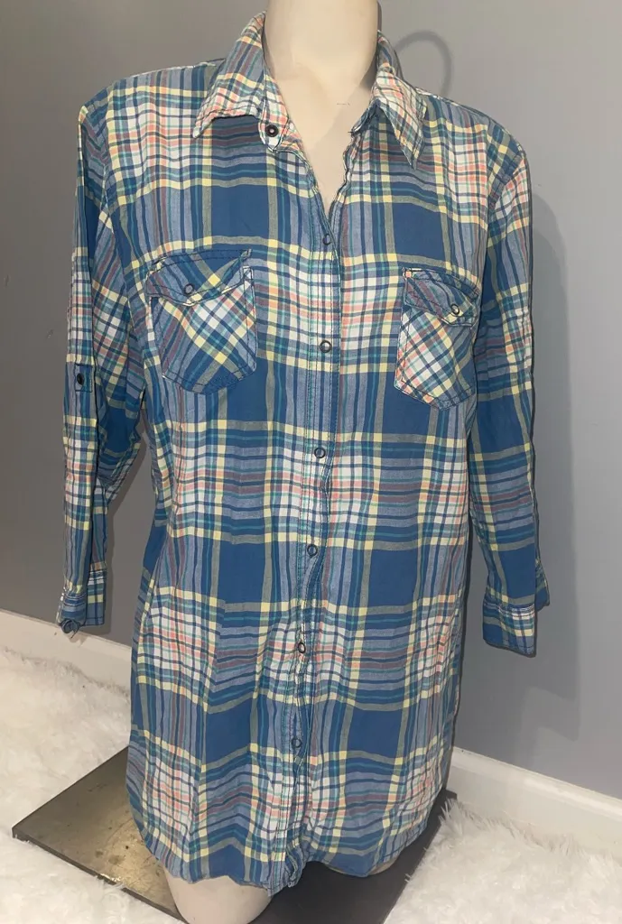 Arizona Jean company blue plaid button up top shirt 3/4 sleeves XL - $10 - From Renee