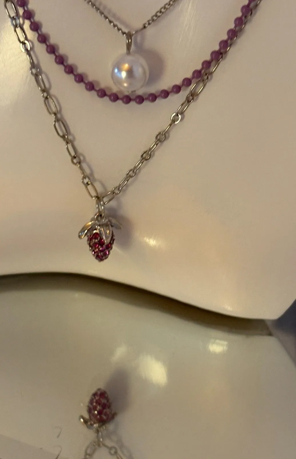 Discover the elegance of this beautiful necklace from Arizona Jean Company. It features two delicate silver chains, each embellished with charming pink rhinestone strawberry charms, faux pearl accents, and vibrant Purple sea beads. The layered design creates a graceful cascading effect, making it an ideal accessory for enhancing the sophistication of any outfit. Thanks for stopping by π I offer a mix of new and vintage finds β some with original tags or packaging, others new without tags. Vintage, handmade, and pre-owned pieces may show light wear or small imperfections, nothing that affects their charm. Any major flaws will always be noted. Origins of metals may be unknown, colors may vary; measurements are approximate. SKU: 6 56514 8686 5 MWS6C