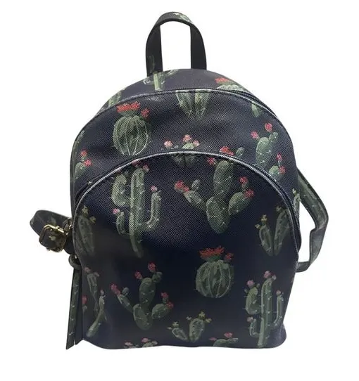 A charming navy blue mini backpack adorned with a playful cactus print featuring pink floral accents. This compact bag offers a stylish way to carry your essentials. The adjustable straps ensure a comfortable fit for everyday wear. Perfect for casual outings, travel, or a fun day at an amusement park. Exterior Material: Polyurethane Style: Backpack Exterior Color: Blue Department: Women Handle/Strap Material: Polyurethane Handle/Strap Color: Blue Lining Material: Polyurethane Hardware Color: Silver Pattern: Geometric Bag Height: 9 in Bag Depth: 5 in Theme: Nature Accents: Tassel, Zipper Features: Adjustable Strap Keywords: cactus, floral, mini backpack, novelty bag, small backpack, day bag, travel bag, cute backpack, print backpack, pink flowers, green cactus, everyday bag, fashion backpack