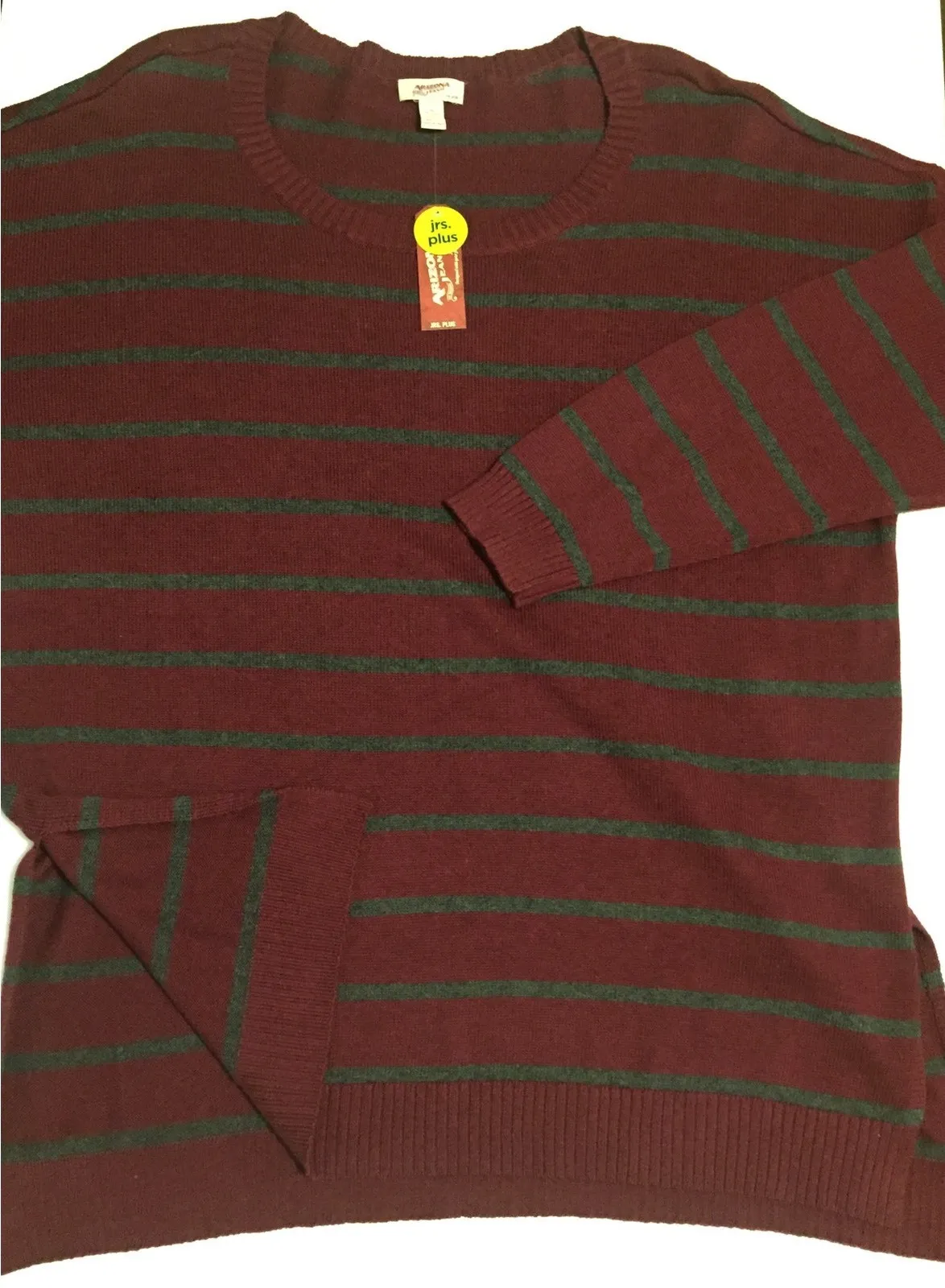 FEATURES New with tags! Great medium weight sweater would be great for layering with a button down. Sweater has two side hip slits. FLAWS N/A BRAND Arizona Jeans TAG SIZE 2X – Juniors Plus COLOR Maroon and Gray SHELL FABRIC 60% Cotton, 40% Polyester APPROXIMATE MEASUREMENTS Chest/Bust (armpit to armpit across, laying flat): 24" Waist (across, laying flat): 22" Hip (across, laying flat): 17" Length (neck to hem): 29" Sleeve Length (neck to cuff): 35"