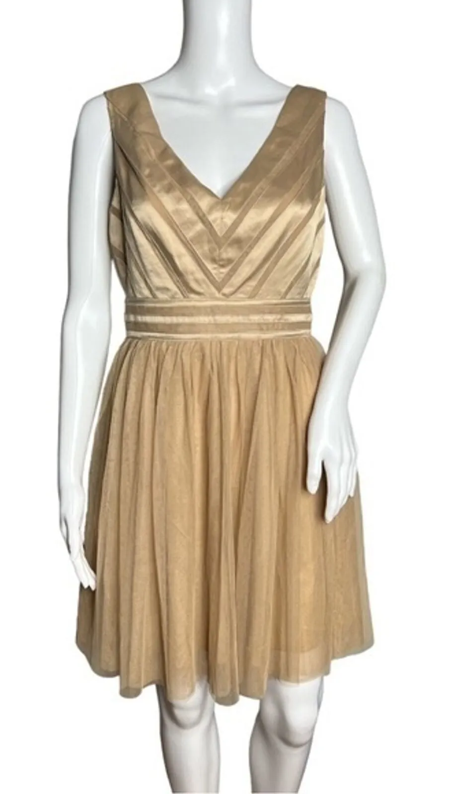 Ark & Co Dress Womens Medium Taupe Satin & Tulle Mini Dress Fit & Flare Fairy Women’s Size Medium V-Neck Sleeveless V Back Fully Lined Hidden Back Zip 100% Polyester Bridal Shower Formal Dance Measurements are Approximate: Length 34” Armpit to Armpit 18” Waist 28” Gently Used Condition. No Rips Tears or Stains (2321)