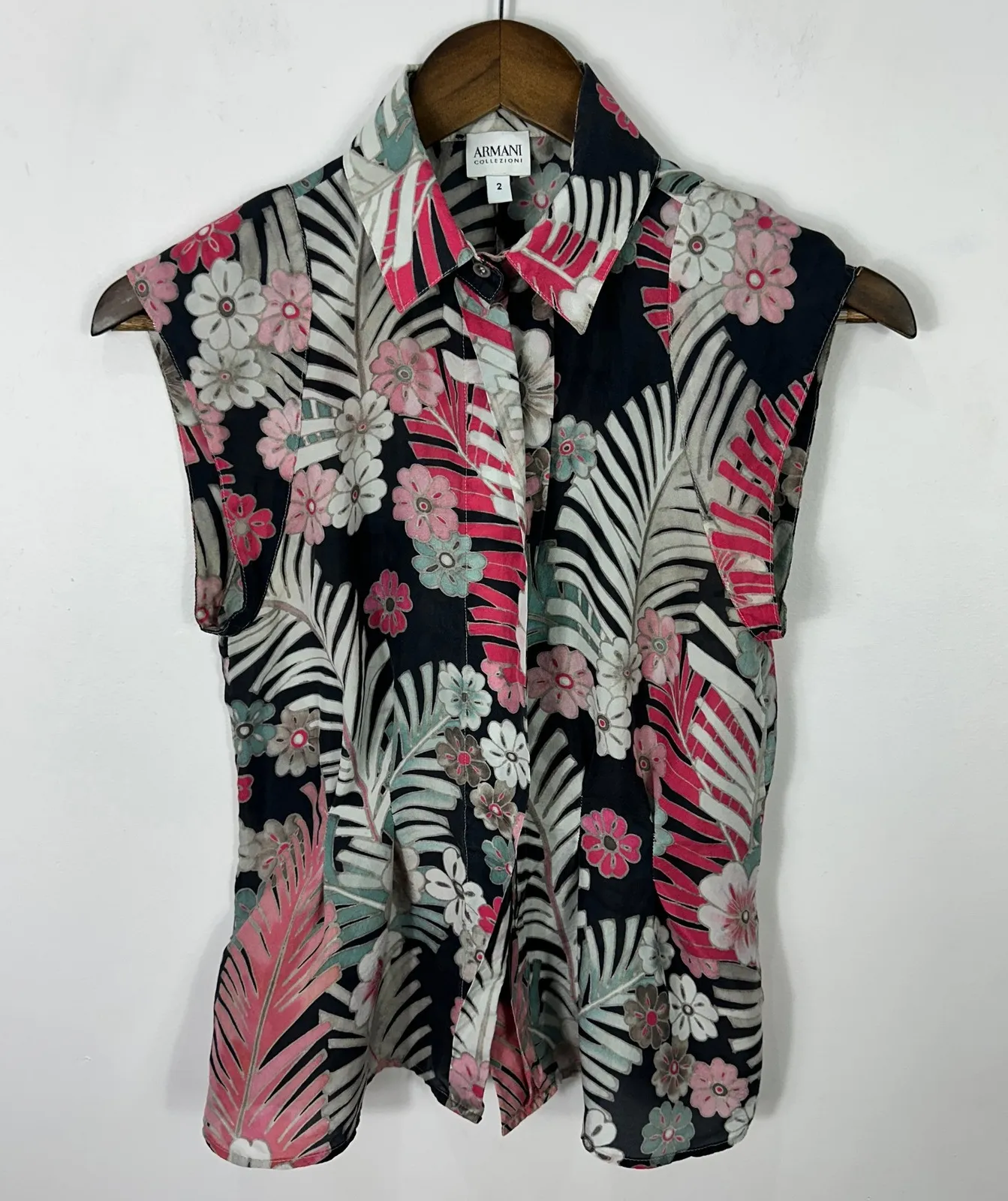 fabric content tag has been worn away. Feels like silk or silk blend • Brand: Armani Collezioni • Size: 2 • Silk-blend woven fabric • Button-front blouse • Soft tropical floral print • Sleeveless design • Lightweight + airy Euro summer • resort chic • luxury feminine • elegant casual • Italian inspired • vacation wardrobe • summer capsule • modern classic