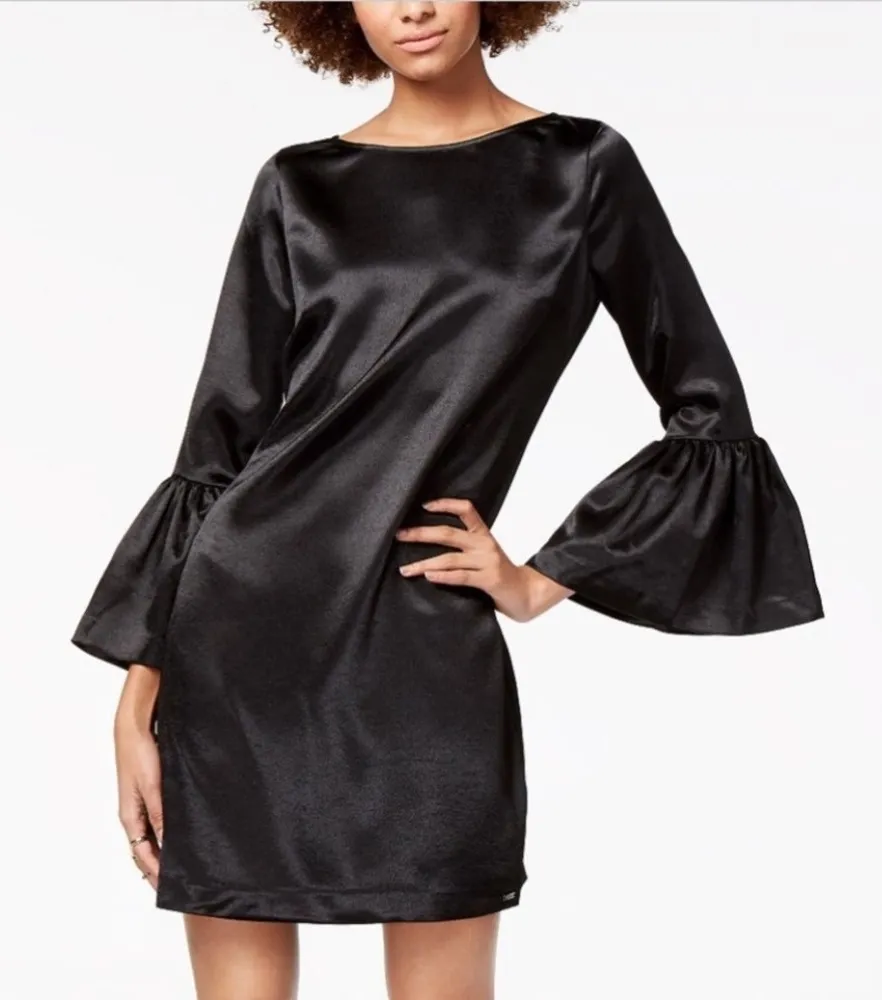 Armani Exchange Black Satin Bell Sleeve Shift Dress Nice used condition Note two runs on front: on... Show more