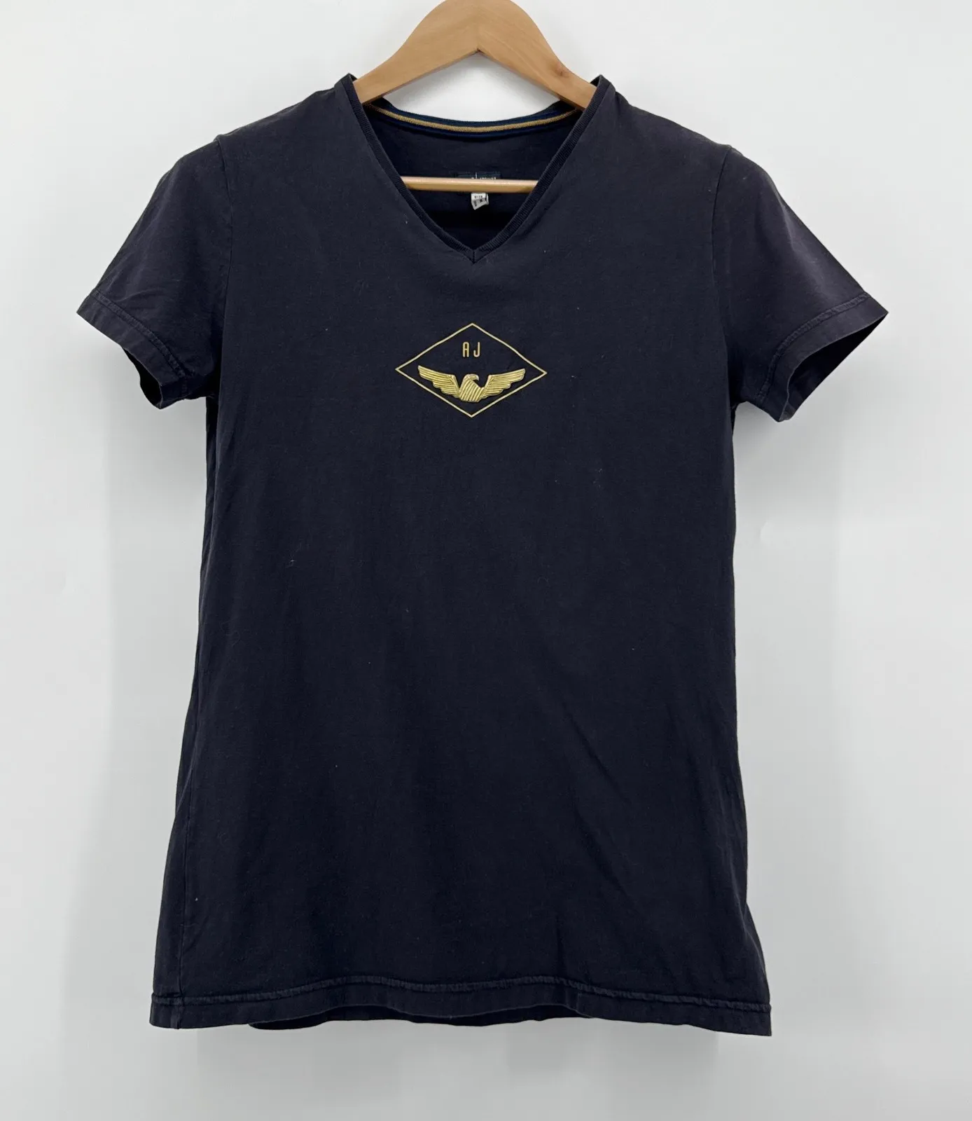 Measurements: • Pit to Pit: 18 in • Length: 27 in Condition: Excellent pre-owned condition. No flaws. Type: T-Shirt Department: Unisex Adults Style: Basic Material: 100% Cotton Neckline: V-Neck Sleeve Length: Short Sleeve Sleeve Type: Classic/Fitted Sleeve Pattern: Solid Accents: Glitter Theme: Metal Features: Contrasting Trim Fit: Regular Fabric Type: Jersey Occasion: Casual Closure: Pullover Keywords: Armani Jeans, AJ, v-neck, eagle logo, graphic tee, casual, designer, short sleeve, navy, men's fashion, streetwear, premium * open to reasonable offers * ships next business day * pet-free and smoke-free home * all items washed, unless dry clean only or hand wash label. Please, wash to wear. * see pictures for details. Colors can vary on different devices.