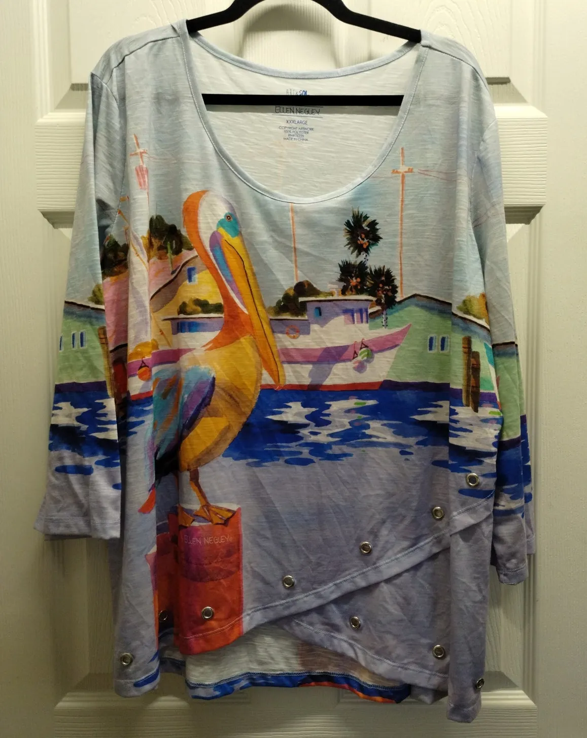 Art & Sol Ellen Negley Women's Size XXXL Pelican Boat Dock Grommet Art to Wear Top Artsy Local Florida Artist - Copyright Artwork - 3/4 Sleeves - Scoop Neck - Asymmetric Hem - Colorful / Multicolor - Beach - Tropical - Vacation Excellent preowned condition, see photos. 28 1/2 inches pit to pit. 27 1/2 inches long in the center of the front. 31 inches long on the back.