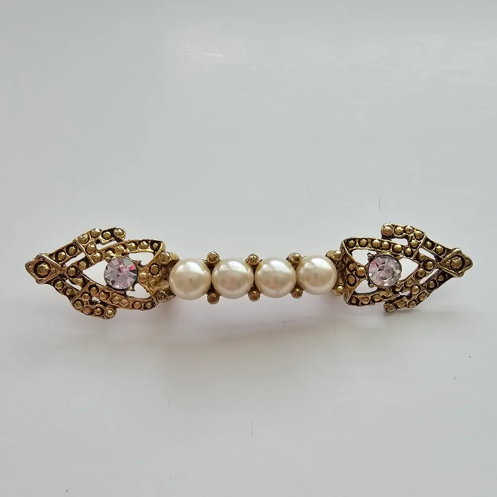 Art Deco Style Yellow Gold Tone Metal Faux Pearl Rhinestone Brooch *Vintage Jewelry Condition Disclaimer* All vintage jewelry pieces are unique and may show signs of wear consistent with their age. Each item is inspected for authenticity and overall condition, but minor imperfections such as surface scratches, tarnishing, or slight color variations are to be expected. Descriptions and photographs aim to provide a clear representation of each piece’s condition. Due to the inherent fragility of vintage and antique items, I sometimes refrain from cleaning them to avoid potential damage to their delicate materials or finishes. Restoration or repairs may have been carried out, and some wear and tear is typical. Origins, dates, and materials are based on my best knowledge and research but may not always be entirely accurate. I strive to accurately describe and represent each piece, so please contact me with any specific condition concerns before purchasing.