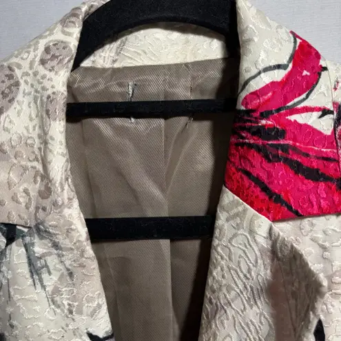 Statement piece with an artistic flair, this floral print blazer exudes a sophisticated yet bold aesthetic. The cream-colored jacket showcases a captivating pattern of red and black floral designs, set against a textured backdrop that adds depth and visual interest. The blazer features a classic lapel, button closure, and functional pockets, blending practicality with high fashion. This eye-catching blazer is ideal for elevating a business casual look, adding a touch of elegance to evening wear, or making a memorable statement at special events. Keywords: floral print jacket, cream blazer, red and black floral, textured jacket, artsy blazer, womens blazer, unique jacket, statement blazer, floral blazer, womens floral jacket, red floral jacket, cream floral jacket, black floral jacket art to wear Some wear. Please see photos for details. Offers welcome!