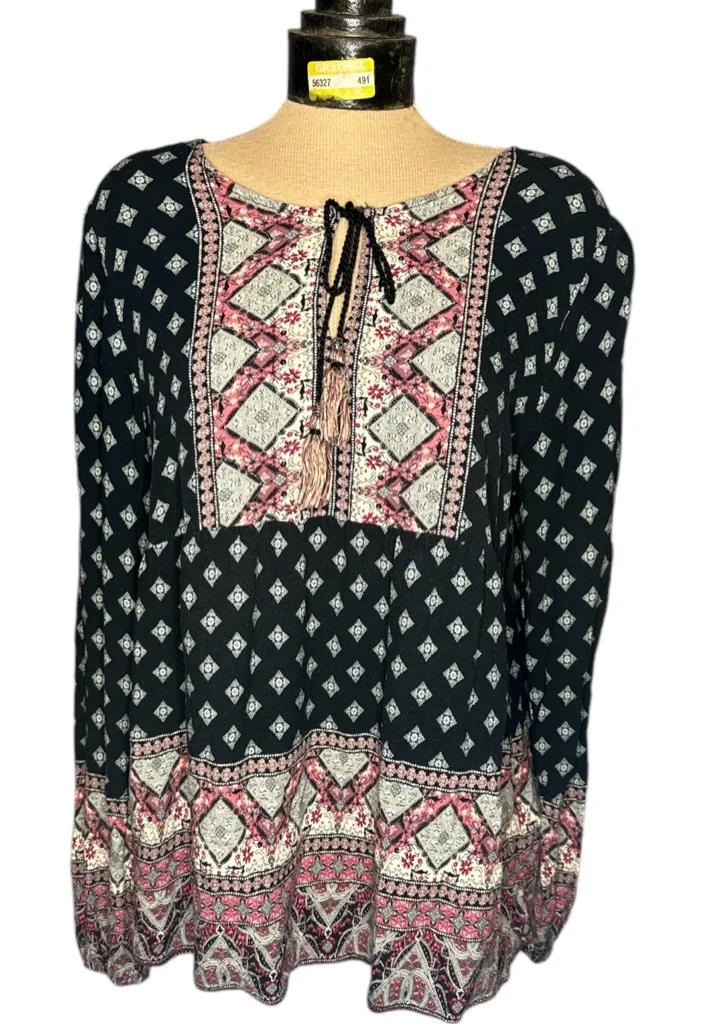 Pre-owned and in good condition. No flaws. Very clean. • Size XL Approximate measurements are shown in photos. • Long Sleeve • Empire Waist • Tassel tie at neck • 100% Rayon Feel free to ask questions. 4.28.25