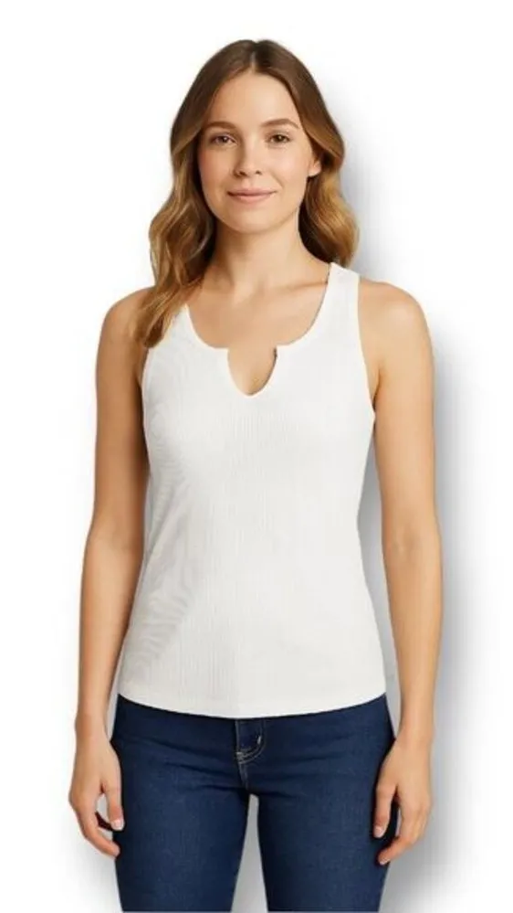 * A timeless white tank with ribbed texture and a playful neckline twist.