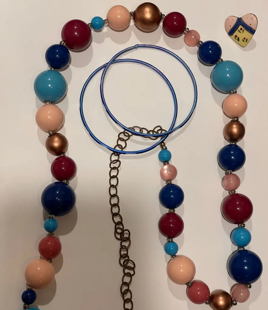 Questions? Leave a comment below! This set includes: Large beaded necklace 2 matching metallic bangle bracelets 1 hand painted heart pin Excellent vintage condition Offers welcome