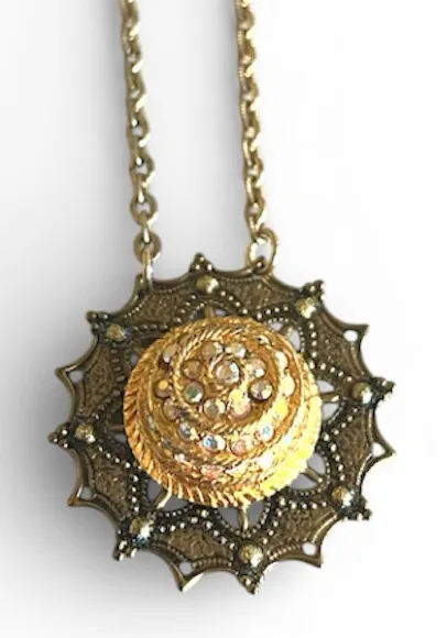 Artisan Crafted Starburst & Golden Rhinestone Dome Pendant Necklace Created using brass jewelry el... Show more