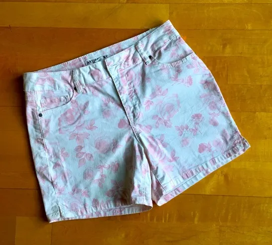 Awesome floral shorts in this seasonâs âitâ color of ivory, cream, ecru with pale, pastel pink floral pattern! Mid rose, crisp, leg openings have side notches for extra style detail and comfort. Super pretty and stylish! From Artisan NY. đ EUC (appears like new!) Size: 6 Approx Measurements: see pics, if avail, too Waist = 14 in Rise = 9 in Length = 13 in Inseam = 4 in Leg Opening = 10.5 in Note: These are an ivory / cream background; see pic comparing to a white tank top for color clarity and validation. Pet/smoke-free home. Will, of course, steam and/or clean the item prior to packing it to remove any wrinkles for you (if appropriate and/or wonât disturb any attached tags, etc).