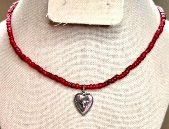 This is a rare and vintage Shube’s Manufacturing Inc. sterling silver pendant necklace. This artisan-style piece is a true statement for collectors of unique and hard-to-find designs. The pendant features a unique heart with a bull-shaped detail and is crafted from .925 Sterling Silver. The pendant hangs from a beautifully handcrafted red beaded necklace, composed of small, rich red beads with subtle black accents. This piece is perfect for those who appreciate vintage jewelry and Southwestern styles. Item Details Maker: Shube's Manufacturing Inc. Material: .925 Sterling Silver Design: Heart with Bull Detail Pendant Necklace: Handcrafted Red Beaded Necklace Length: 17 inches total circumference (including pendant drop, approximately 8.5 inches laid flat Condition Note This necklace is in excellent use condition and has been carefully stored from a pet free smoke free home