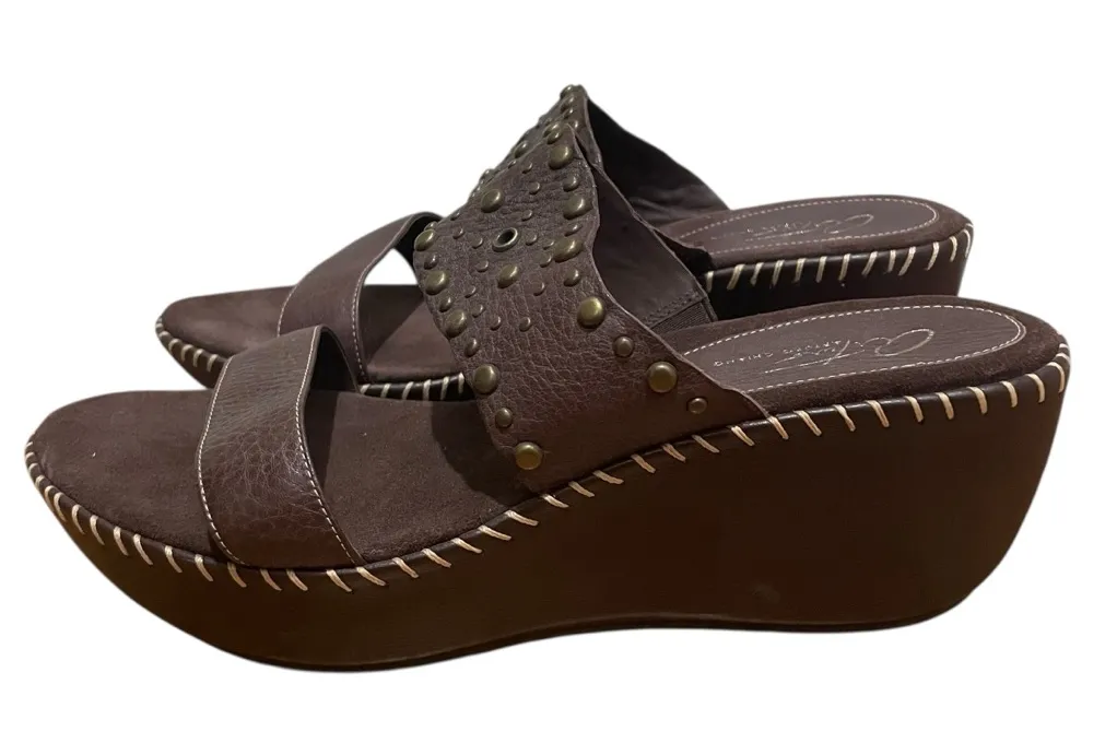 Arturo Chiang “Patty” wedge sandals in rich brown leather. Features studded detailing, contrast stit... Show more