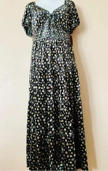 Soo Cute & Soft! 😍 You'll be living in this adorably feminine maxi dress with its comfortable smocked waistline, flowy tiered skirt, and fun puff sleeves! Perfect for breezy autumn days with its adorable garden-inspired touch, it makes for a dreamy wedding guest or date night look. Lightweight and breathable, it can easily be dressed up with wedges or kept casual with booties. • Fit: Fitted at waist with flow, effortless skirt • Closure: Slip on • Material: 94% Polyester, 6% Spandex • Hidden side pockets, Smocked waistline, Elastic puff sleeves, Tiered skirt, Faux front tie, Velvet touch, Floral print • Short Sleeve