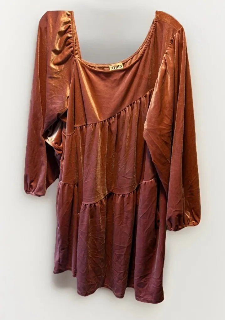 It has pockets! Comes from a smoke free home. Looks like it’s never been worn! The Arula sizing says this is a size A which is about an XL/1X size. It’s very stretchy and forgiving, please see photos for measurements on pit to pit and length. This Arula Pink Velvet Short Tiered Babydoll Dress in size A XL/1X features long puff sleeves and a round neck, perfect for a party or cocktail occasion. Made from polyester with a velvet fabric type, this mini dress is stylish and chic. The layered accents and short dress length add a touch of femininity to your summer or spring wardrobe. Designed for plus-size women, this dress from Arula is a must-have for those who want to make a statement with their fashion choices.